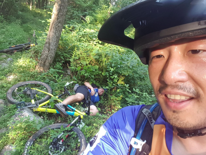 That last one is the o e he got poison ivy that got infected. He can no longer ride thru that very simple section cause the yips lol.