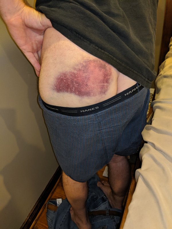 The other cheek was jealous and wanted some symmetry.Checking this thread some of the nice purple bruise pics reminded me of this fun one. Thought i would share a gratuitous butt pic. I had a hip pad just an inch or 2 to the side of whetlre and he rock hit. Better now but the real weird thing was when it spread across the crack to the other cheek.View attachment 132027